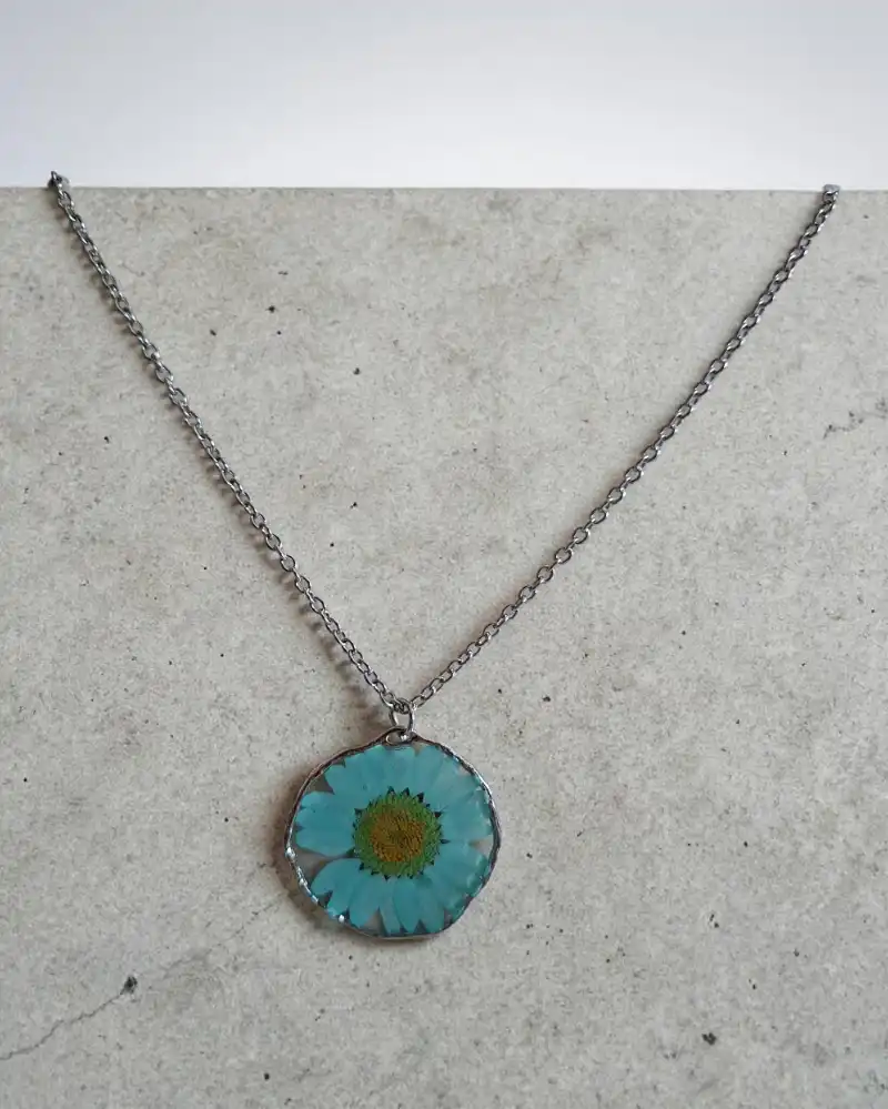 Collar encapsulado en resina uv, margarita azul natural. Con cadena de acero inoxidable.